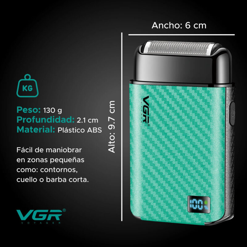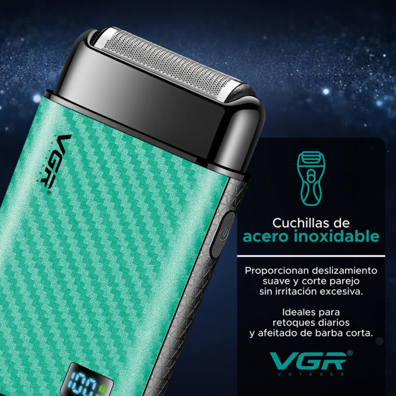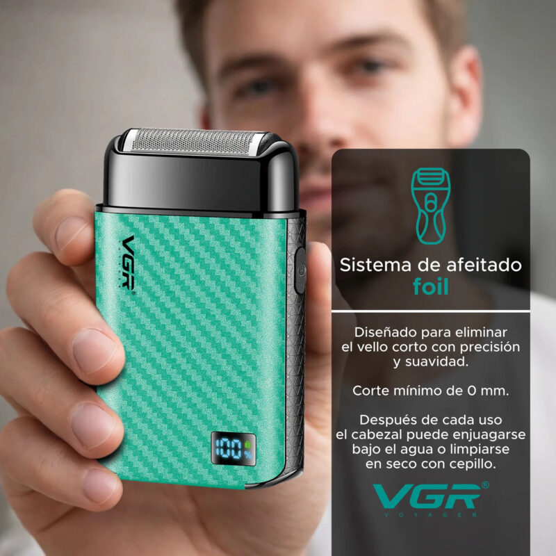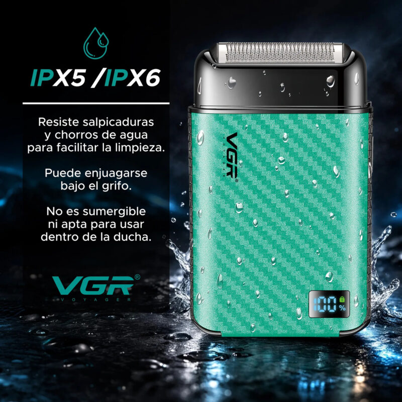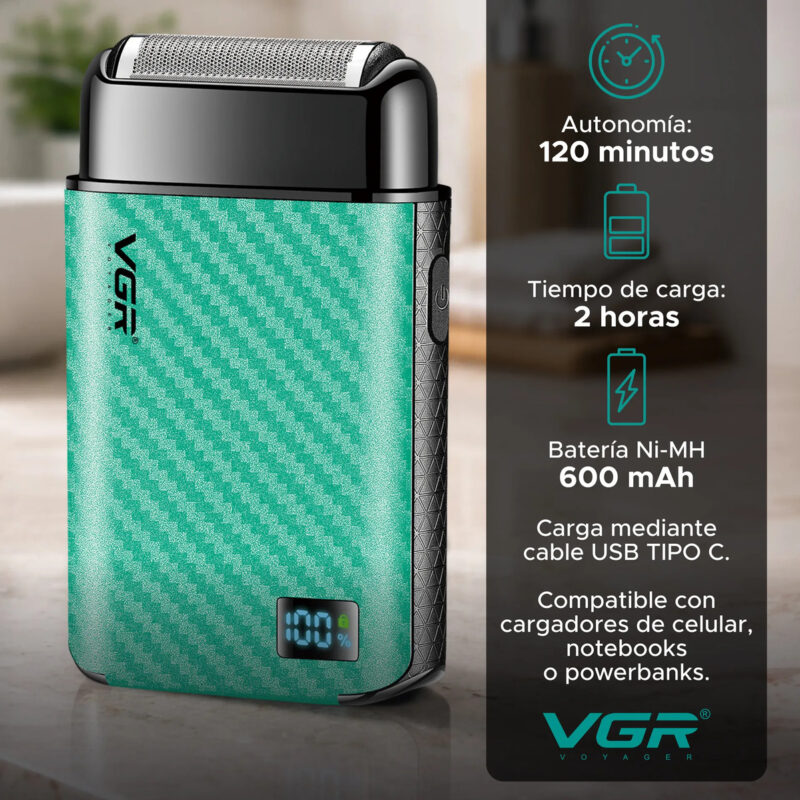 Cuenta con resistencia al agua IPX6, soportando chorros de agua para una limpieza segura (no apta para sumergir ni usar en la ducha). Su batería de 600 mAh se carga en 2 horas y brinda hasta 120 minutos de uso, equivalente a entre 6 y 10 afeitadas, con display LED que muestra la batería restante.
