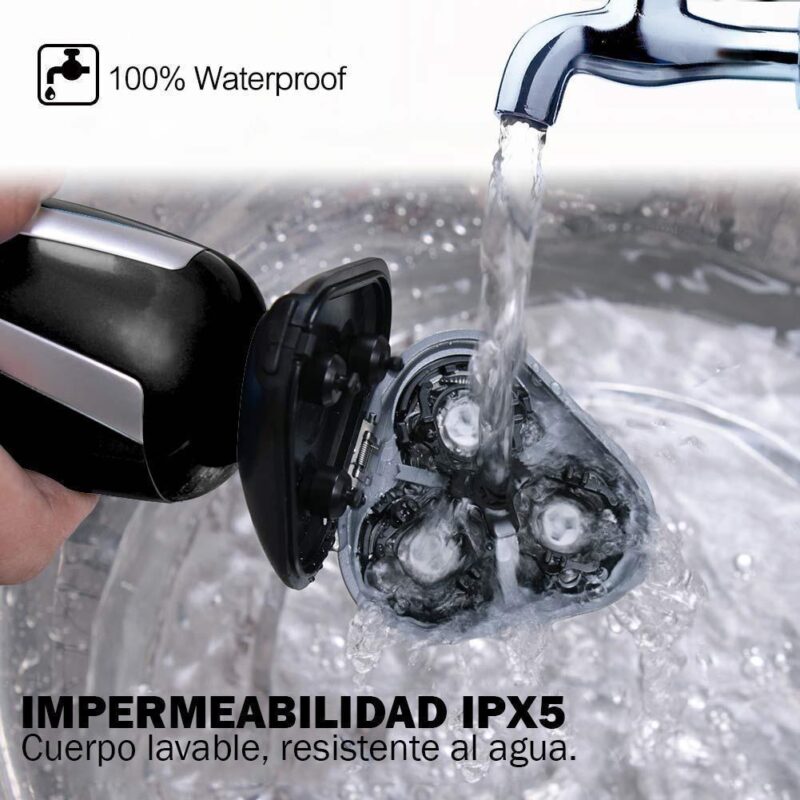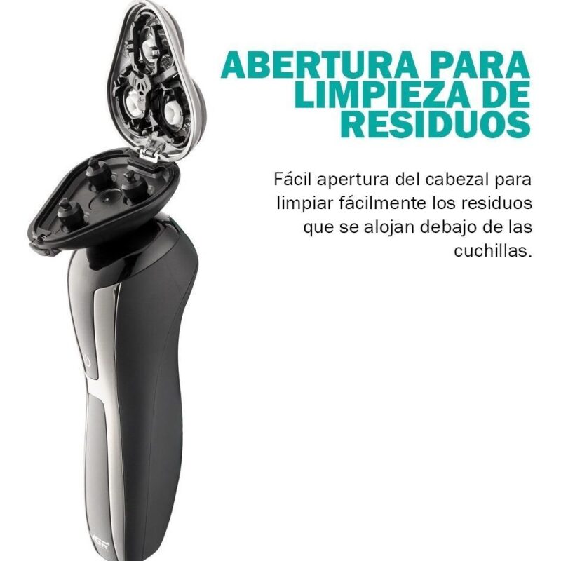 Cabezal cómodo y sin residuos de afeitado; la red de cuchillos de superficie curvada de doble anillo aumenta considerablemente el área de contacto de la cara, con una hoja interna afilada, afeitado suave y limpio. Revestimiento doblemente impermeable; La hoja y el cuerpo se pueden lavar. Las afeitadoras de limpieza profunda previenen las bacterias. Afeitado en húmedo con espuma para uso en húmedo y en seco. Motor de alta potencia; La potencia fuerte y estable reduce el ruido y los golpes. – Capture la diferencia entre el tipo de barba dura y blanda para un afeitado fácil. – Corte las raíces de la barba sin tirar. Tres cabezales de corte de chapa flotante independiente; Chapa elástica integral para un afeitado flexible. La barba de la esquina muerta se puede afeitar fácilmente con la red de cuchillas de doble anillo, al ser un área de contacto más grande, es un afeitado más eficiente. Carga USB Tensión universal mundial: Conveniente carga USB Se pueden cargar computadoras portátiles, cargadores, automóviles, etc. La luz es roja indica cuando se está cargando y la luz es verde indica cuando está completamente cargada.