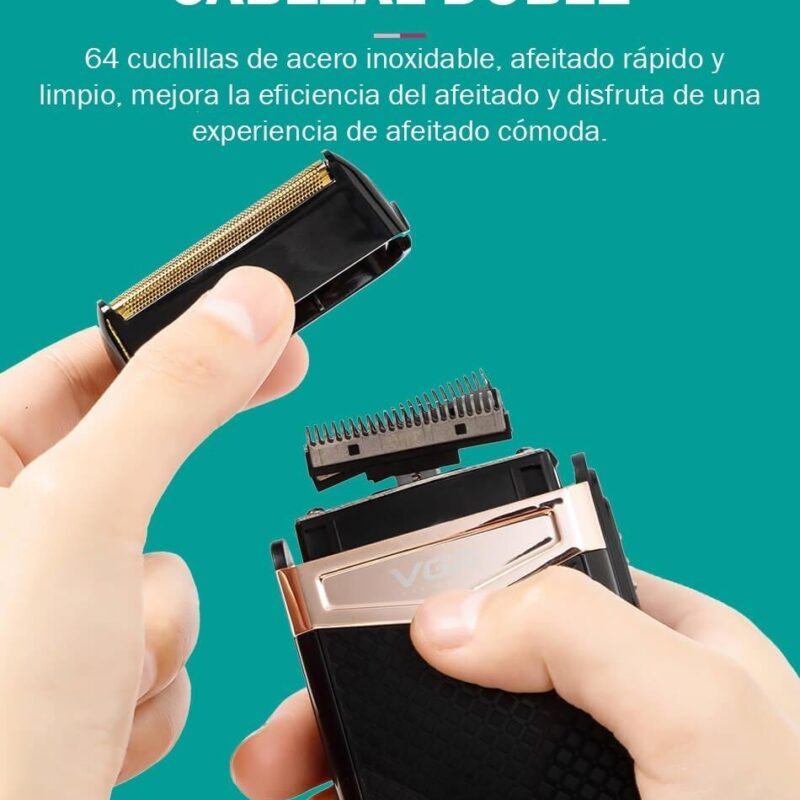 Afeitadora rasuradora color negro con detalle en rosa metálico. Posee dos cuchillas metálicas fáciles de remover al momento de su lavado. Con tecnología IPX4 que la hace impermeable. Ideal para cortar pelo y barba al ras. También esta diseñada para calvicie.
