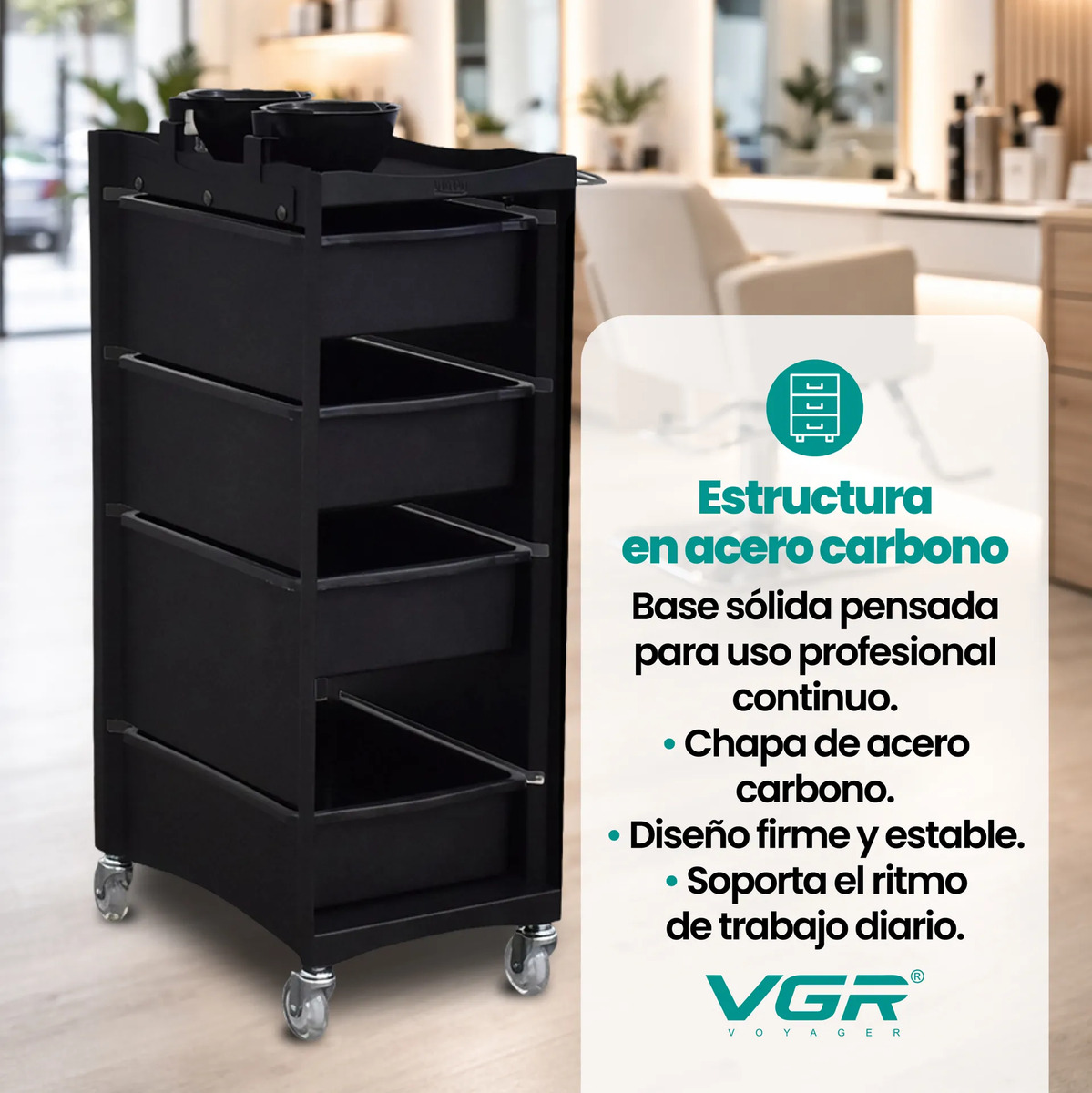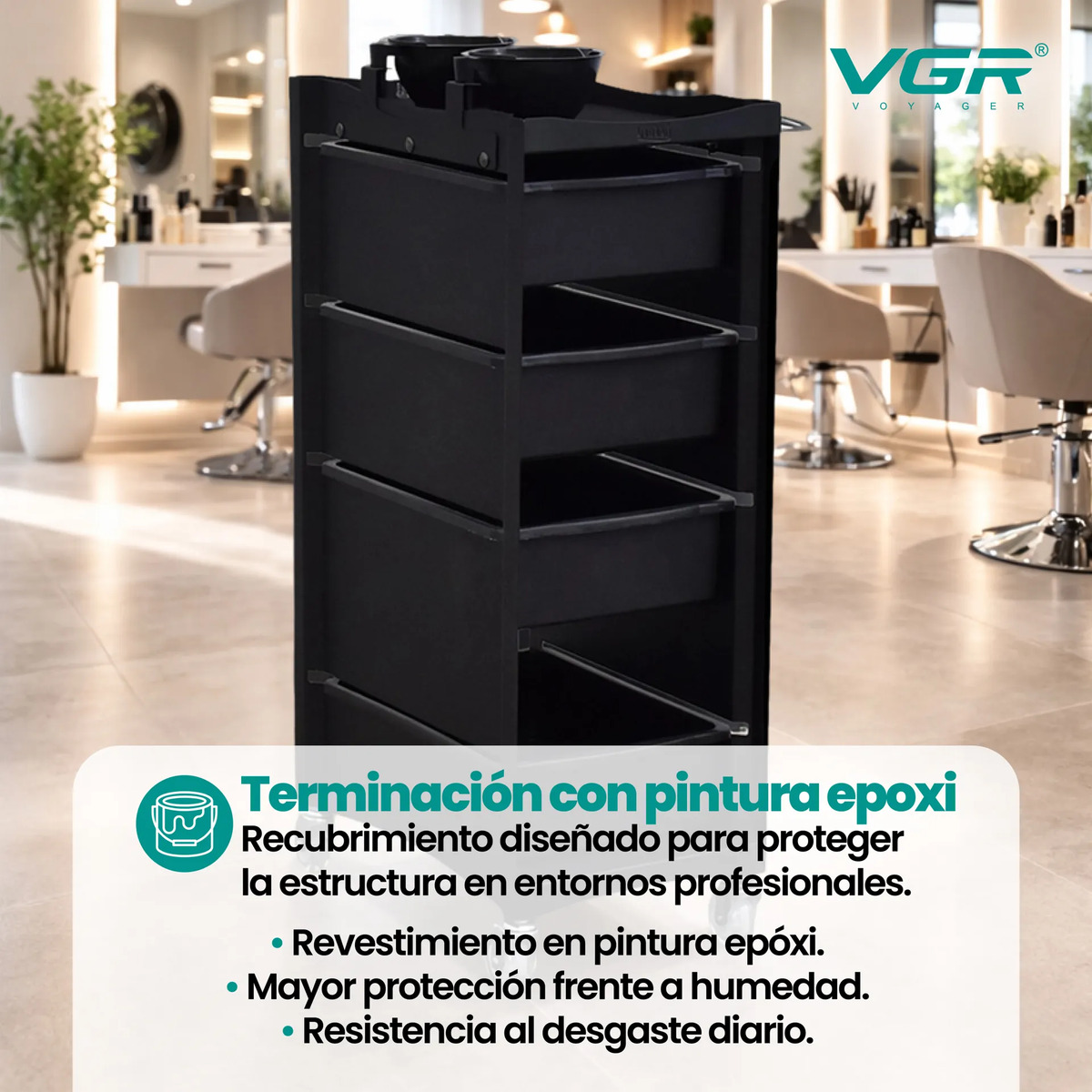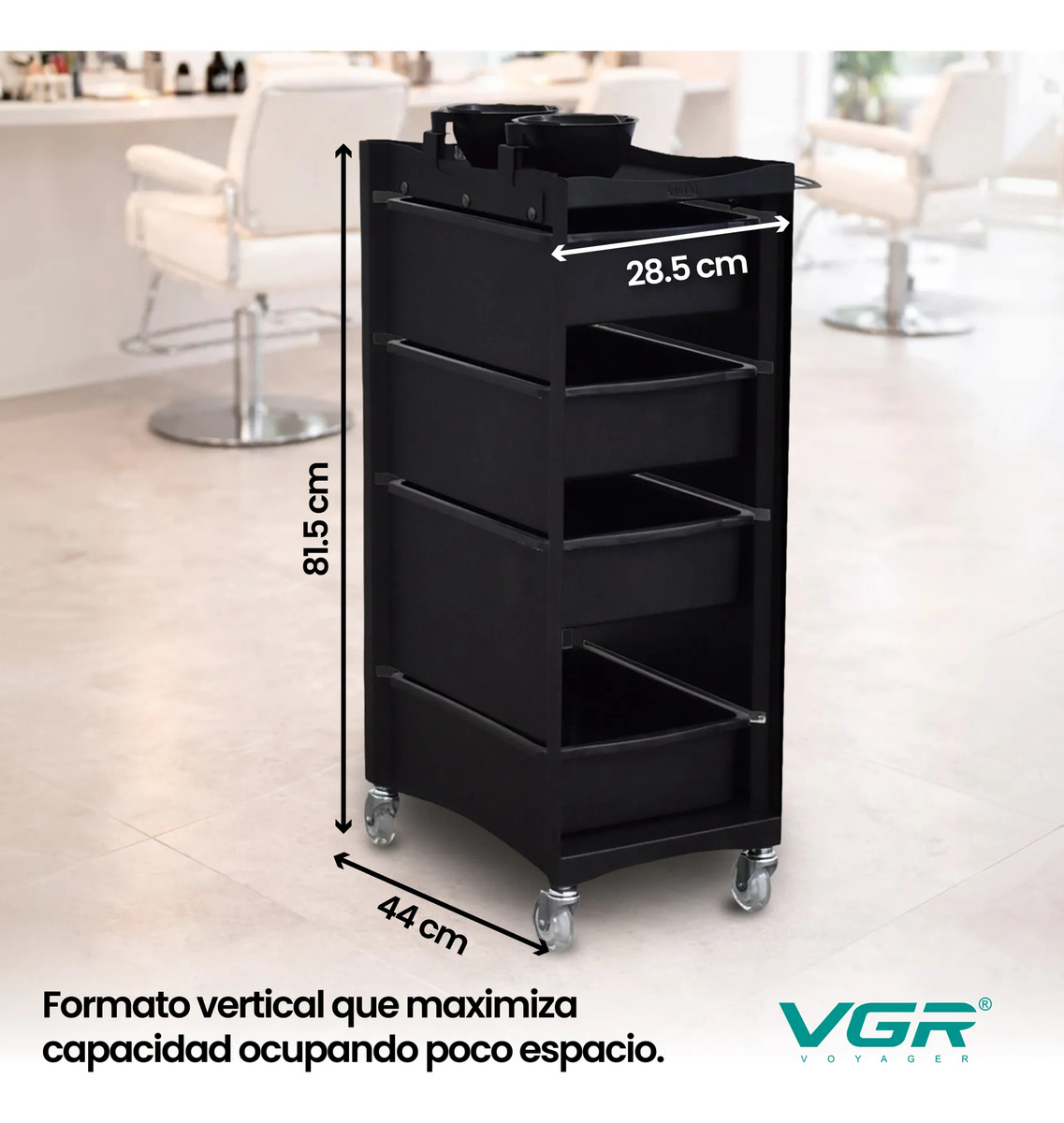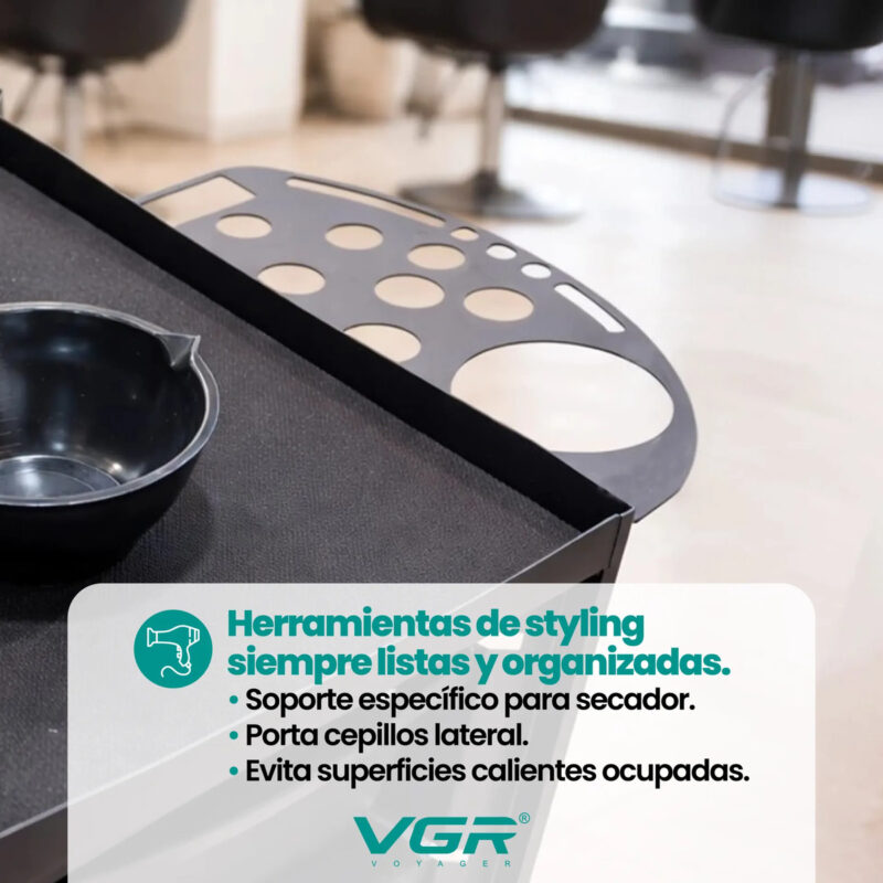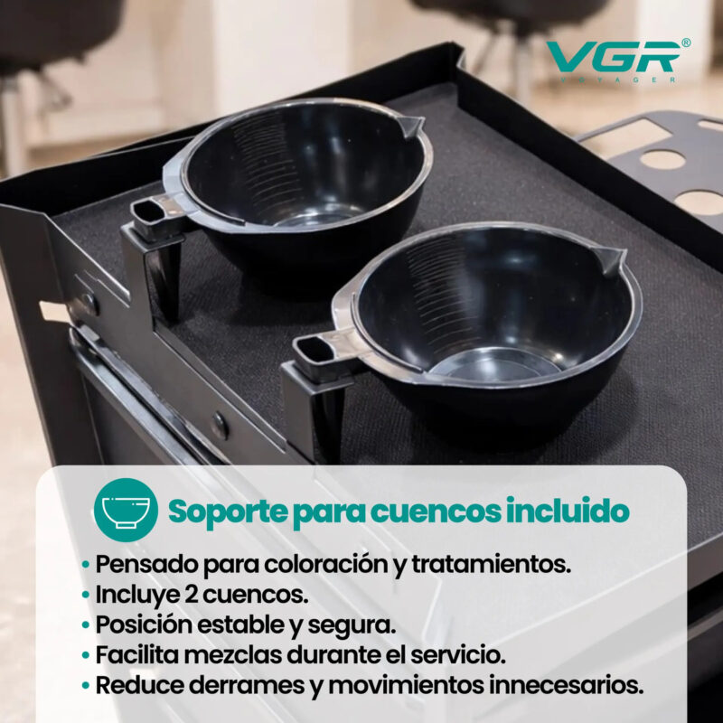 Cuenta además con soporte para cuencos incluidos, especialmente pensado para coloración y tratamientos, facilitando las mezclas y reduciendo derrames durante el trabajo técnico.