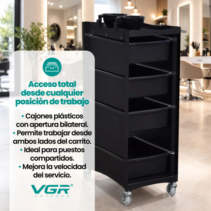 Su sistema de cajones con apertura bilateral permite acceder al contenido desde ambos lados, ideal para puestos compartidos o trabajo continuo sin interrupciones. Incluye porta secador, soporte para cepillos y una bandeja superior amplia para mantener las herramientas más utilizadas siempre a mano.