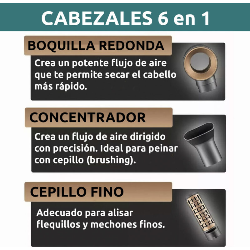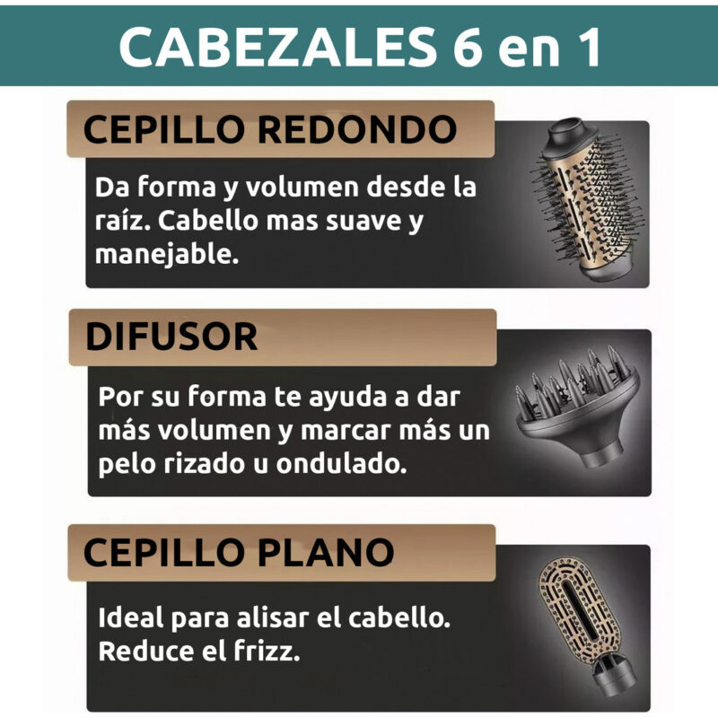 6 Accesorios intercambiables: un concentrador estrecho, un difusor, un cepillo estrecho, un cepillo plano, un cepillo elíptico