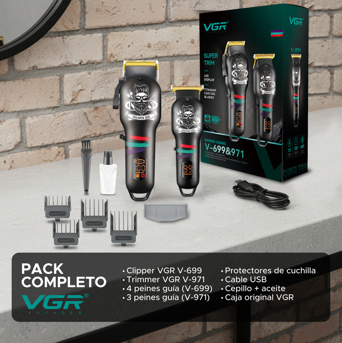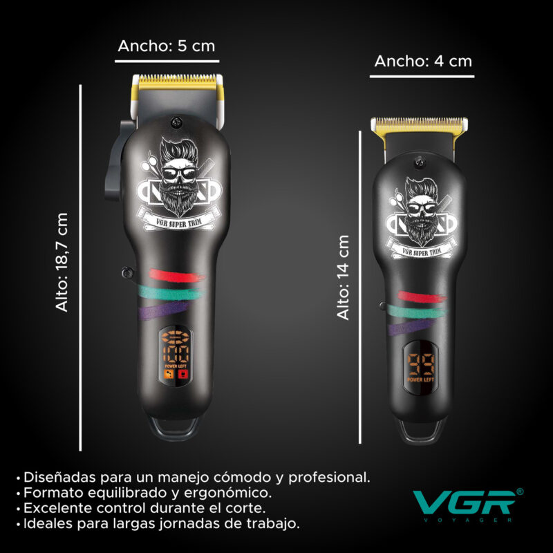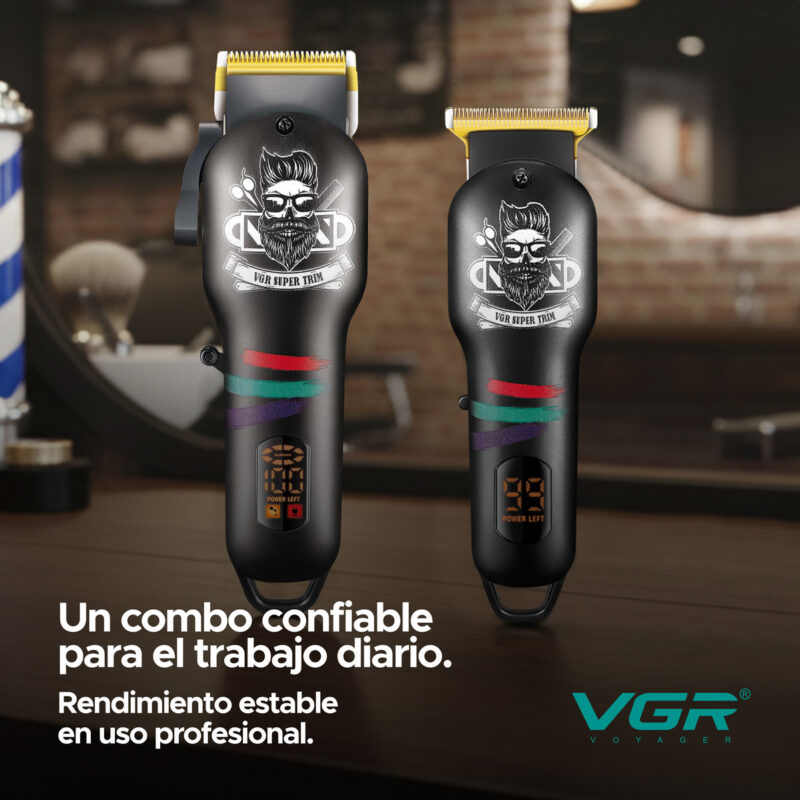 El Combo VGR V-699 & V-971 es el kit ideal para comenzar en barbería o reforzar tu equipo de trabajo. Incluye clipper y trimmer profesionales, pensadas para cortes completos, fades y terminaciones con resultados prolijos.