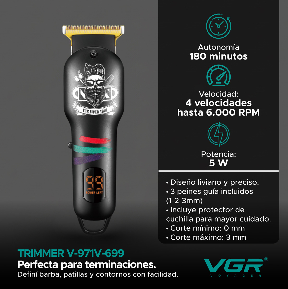 La Trimmer V-971 es liviana y precisa, ideal para contornos y detalles, con 3 peines guía (1–2–3 mm).