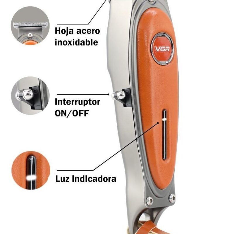 Cortadora de pelo VGR, diseño elegante, control riguroso de ingeniería, excelente calidad, para satisfacer todas sus necesidades. El Cuerpo de metal de cuero Retro, diseño ergonómico, antideslizante, cómodo de sostener, portátil y compacto, y se puede llevar a cualquier lugar.
