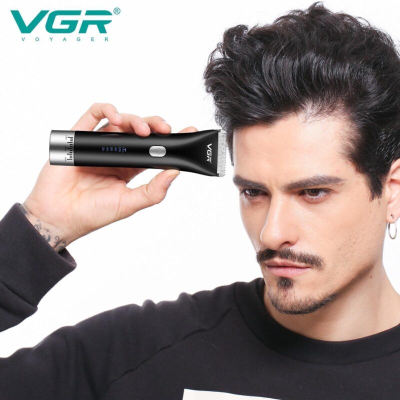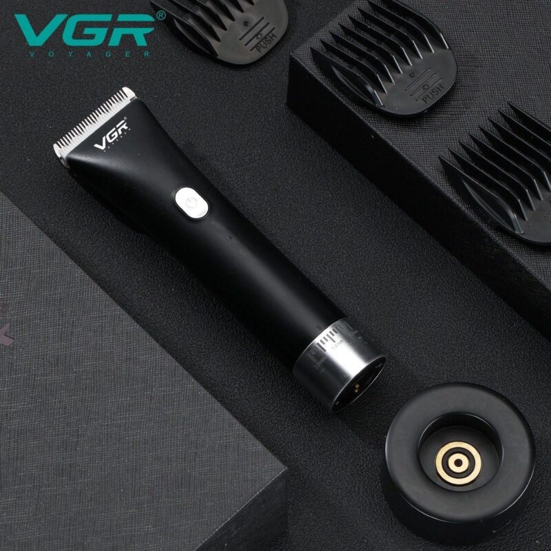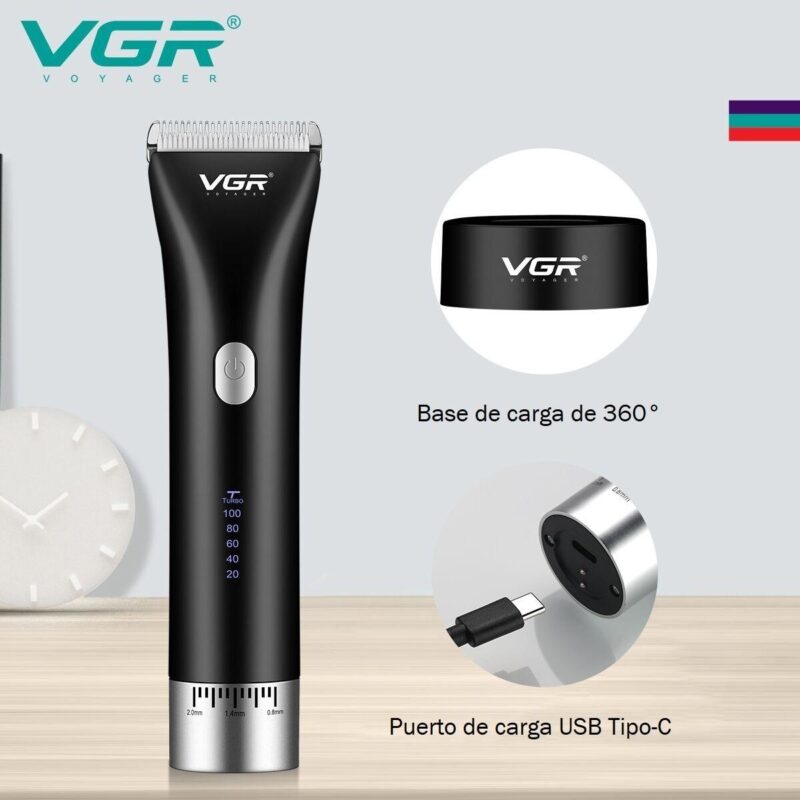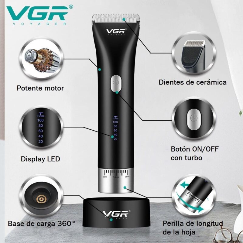 Maquina corta pelo y afeitadora VGR color negro con cuchillas de acero inoxidable de precisión con cubierta de titanio. Hojas fácil de desmontar y lavar. Ideales para cortes de pelo largo. Peines de diferentes medidas (3 mm / 6 mm/ 9 mm/ 12 mm). Posee una luz LED que indica el nivel de batería.