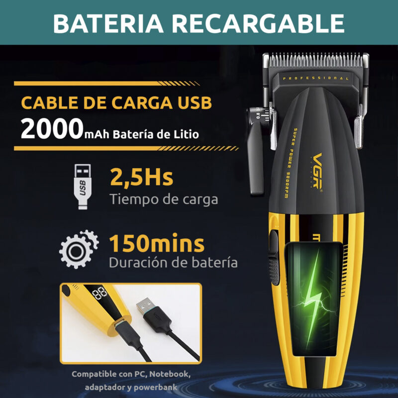 MÁQUINA CLIPPER BARBERÍA PROFESIONAL CORTA PELO VGR V-285 INALAMBRICA VELOCIDAD 9000 RPM 7W