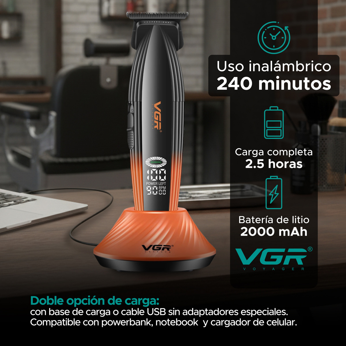 La pantalla LED inteligente muestra el porcentaje de batería y las RPM en tiempo real. Su batería de 2000 mAh ofrece hasta 240 minutos de uso continuo y se carga completamente en 2,5 horas. Incluye doble opción de carga: base o cable USB, compatible con powerbank, notebook o cargador de celular.