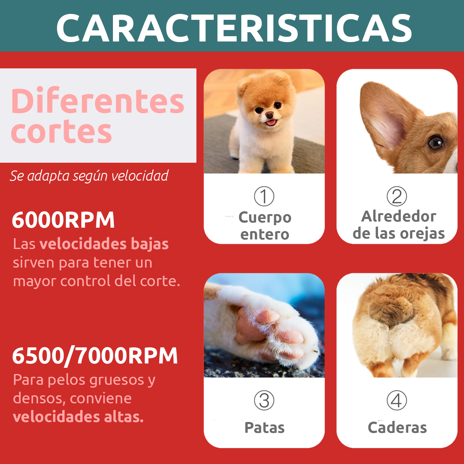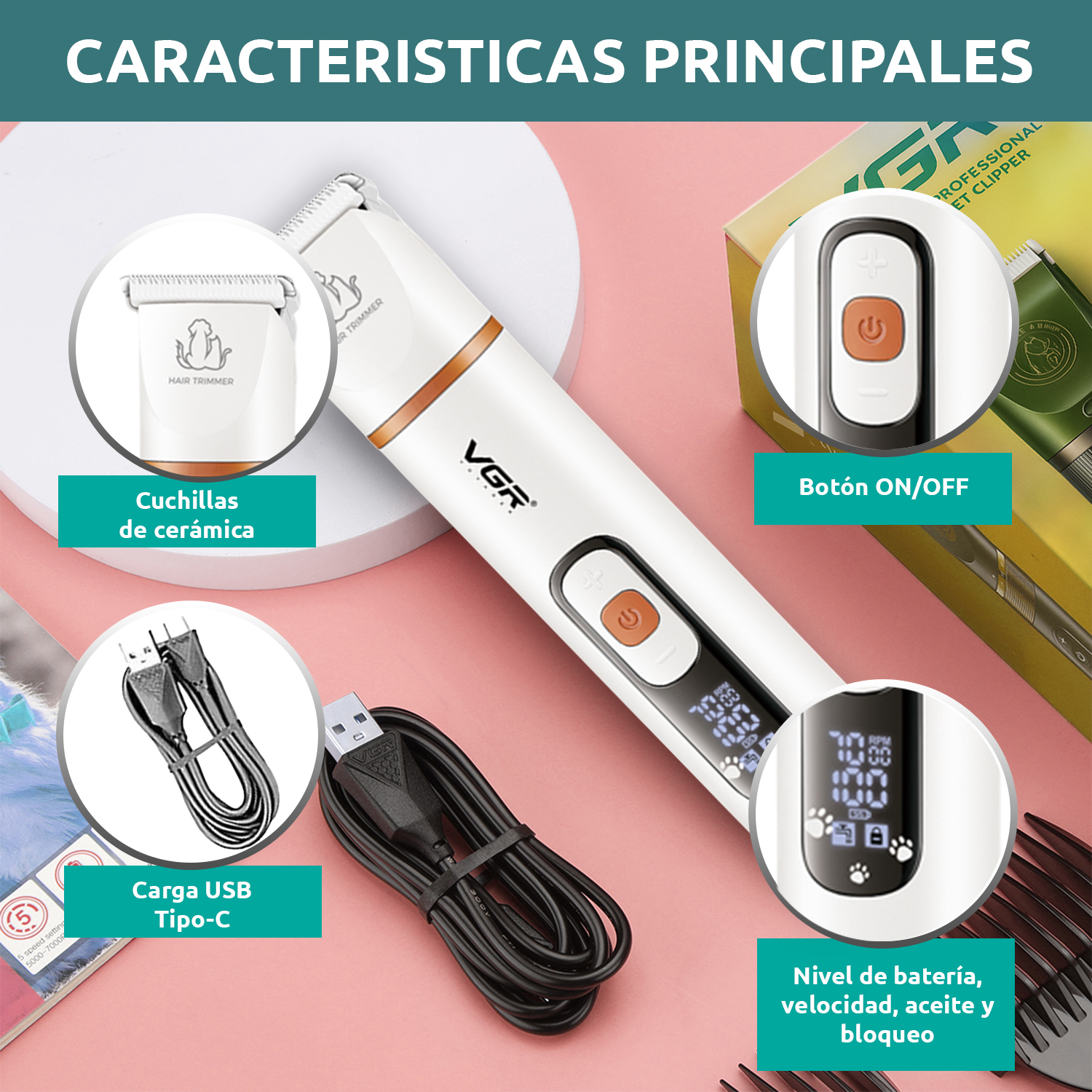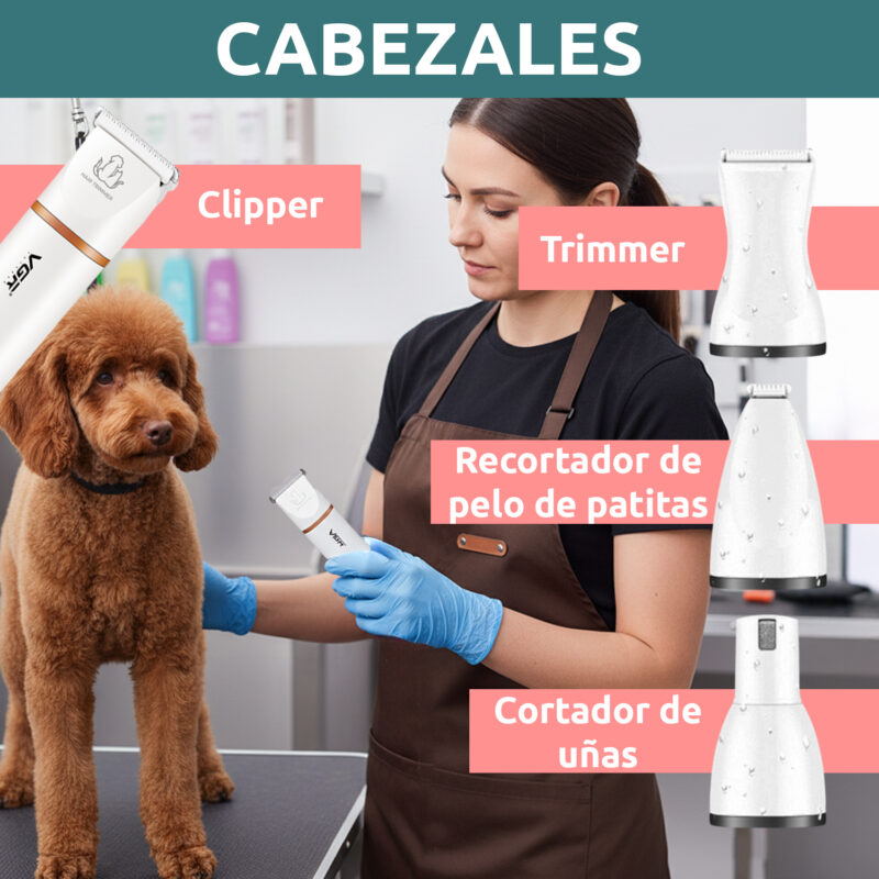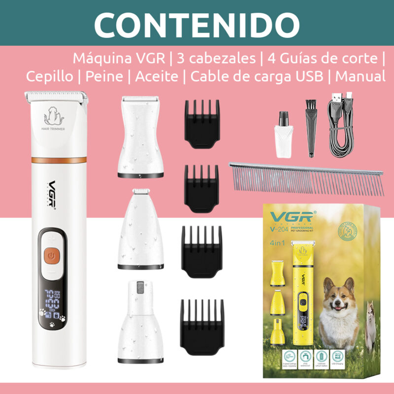 Incluye accesorios esenciales como cabezales, guía de corte, peine y aceite, asegurando que tengas todo lo necesario para un mantenimiento completo. Con tres velocidades ajustables y una pantalla digital, podrás personalizar la experiencia de corte según las necesidades de tu mascota.