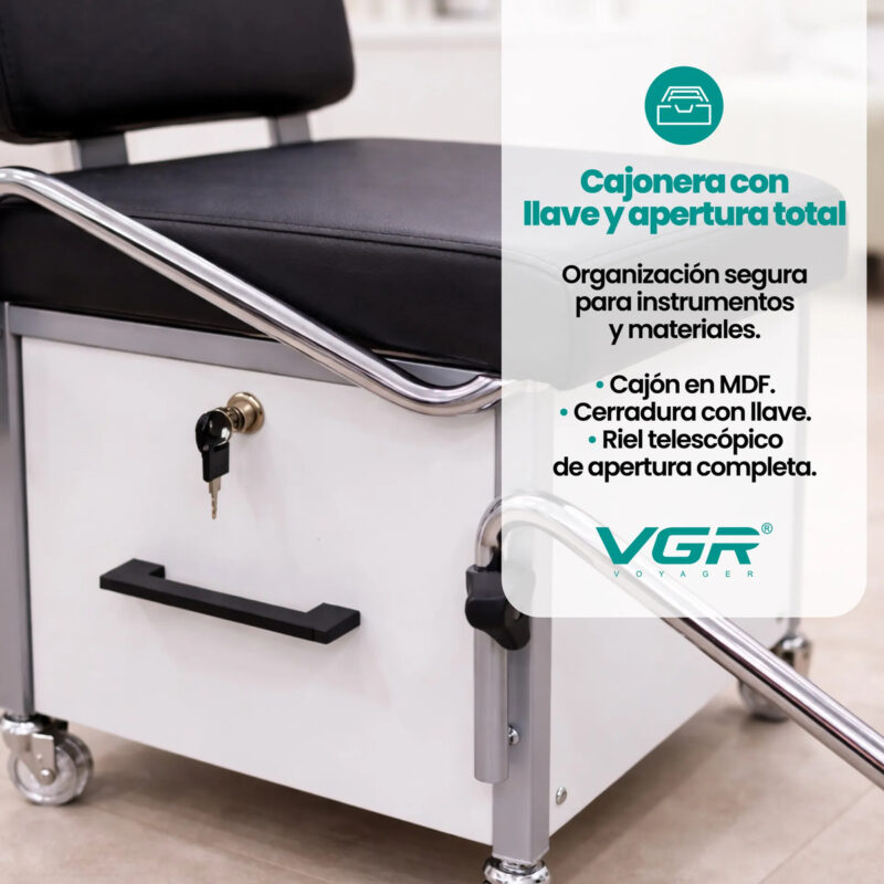 Cuenta con apoyapiés acolchado desmontable y regulable que permite posicionar el pie del cliente con máxima precisión según el procedimiento, facilitando además la limpieza y desinfección entre servicios.
