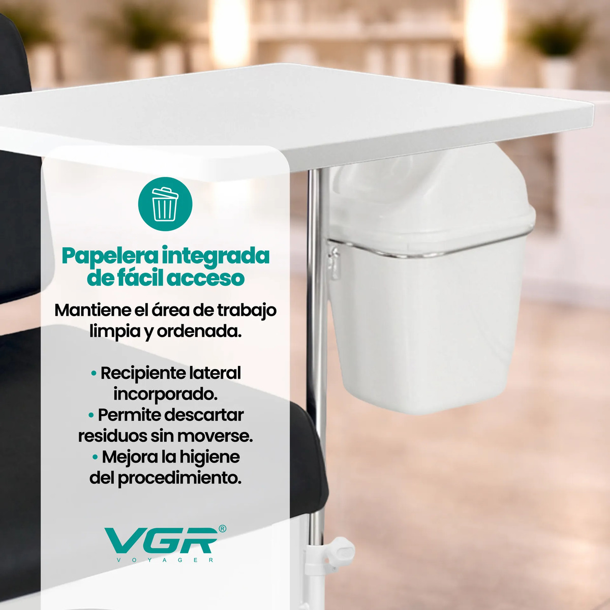 La papelera lateral integrada mantiene el área ordenada sin necesidad de desplazarse, mientras que el cajón con llave y apertura total brinda almacenamiento seguro para herramientas y materiales.