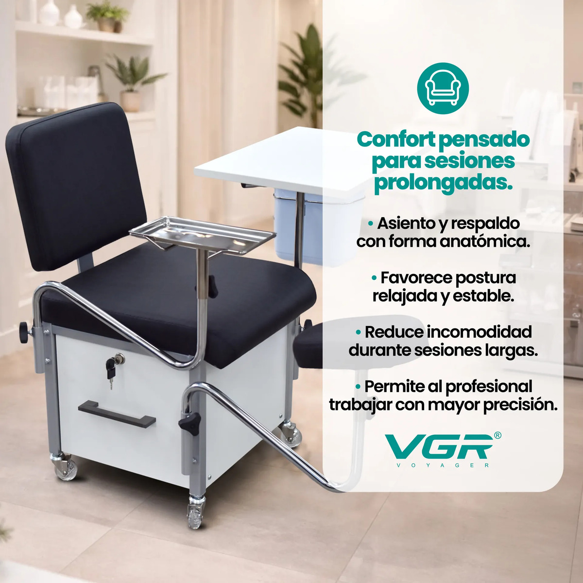 Su diseño ergonómico favorece la comodidad durante sesiones prolongadas, tanto para el cliente como para el especialista, optimizando la postura y la precisión del trabajo.