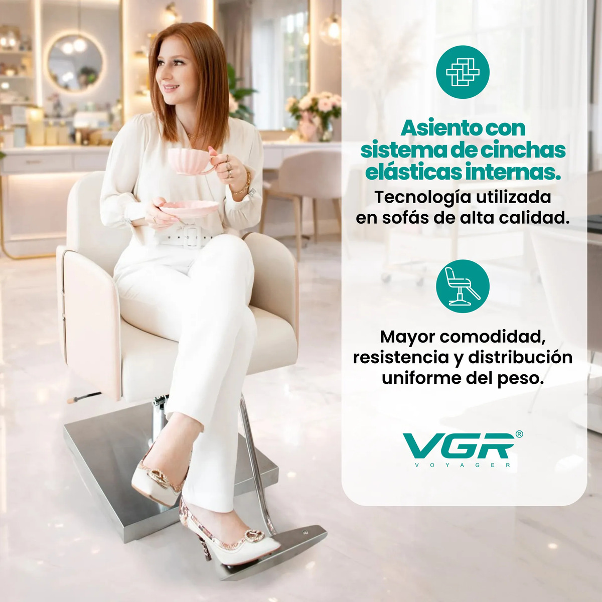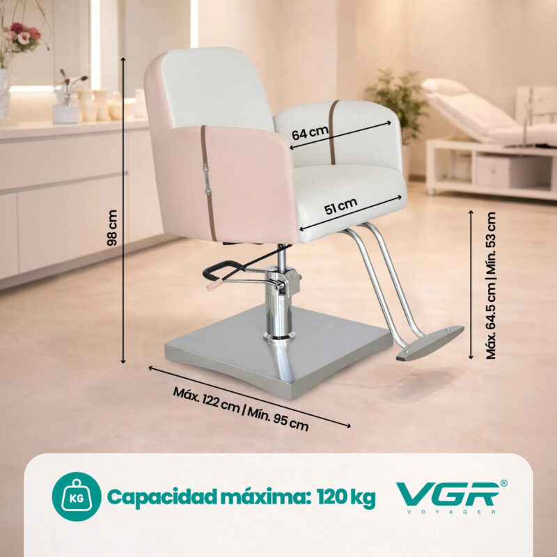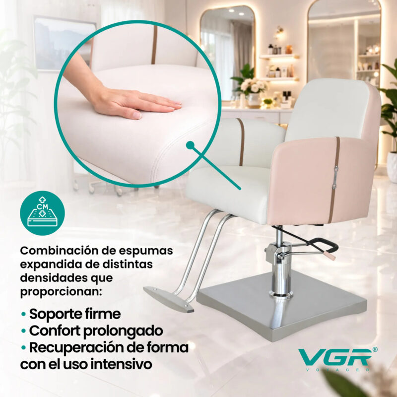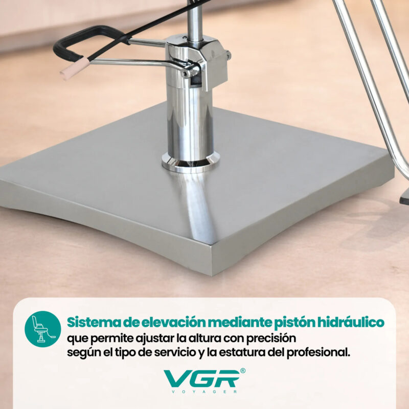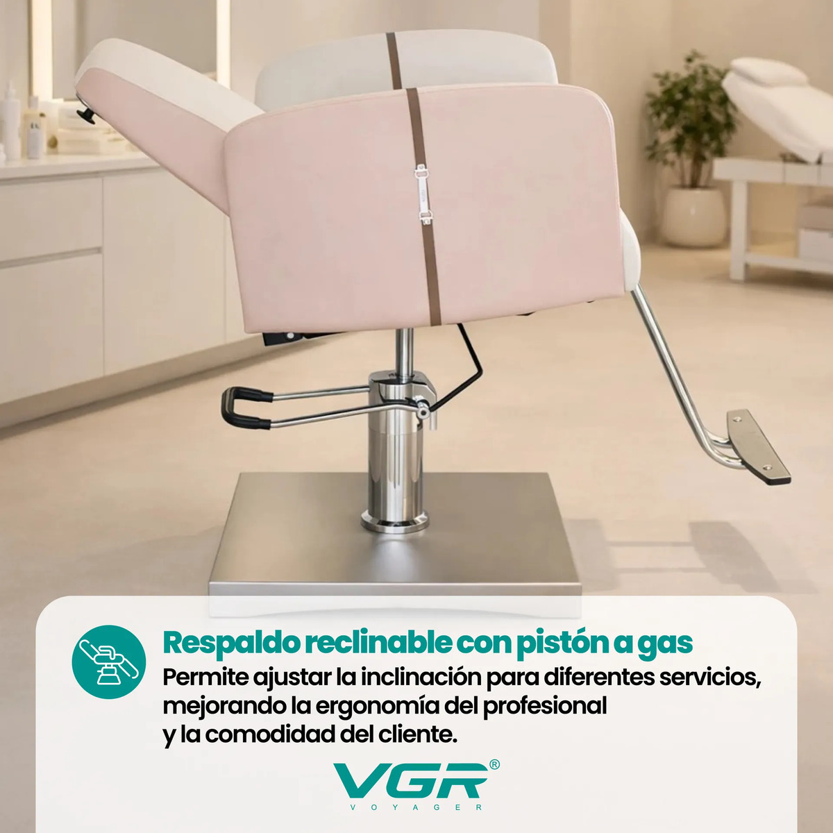 El respaldo reclinable con pistón a gas permite ajustar la inclinación según el tipo de servicio, mientras que la base hidráulica facilita regular la altura con precisión para adaptarse a cada profesional.