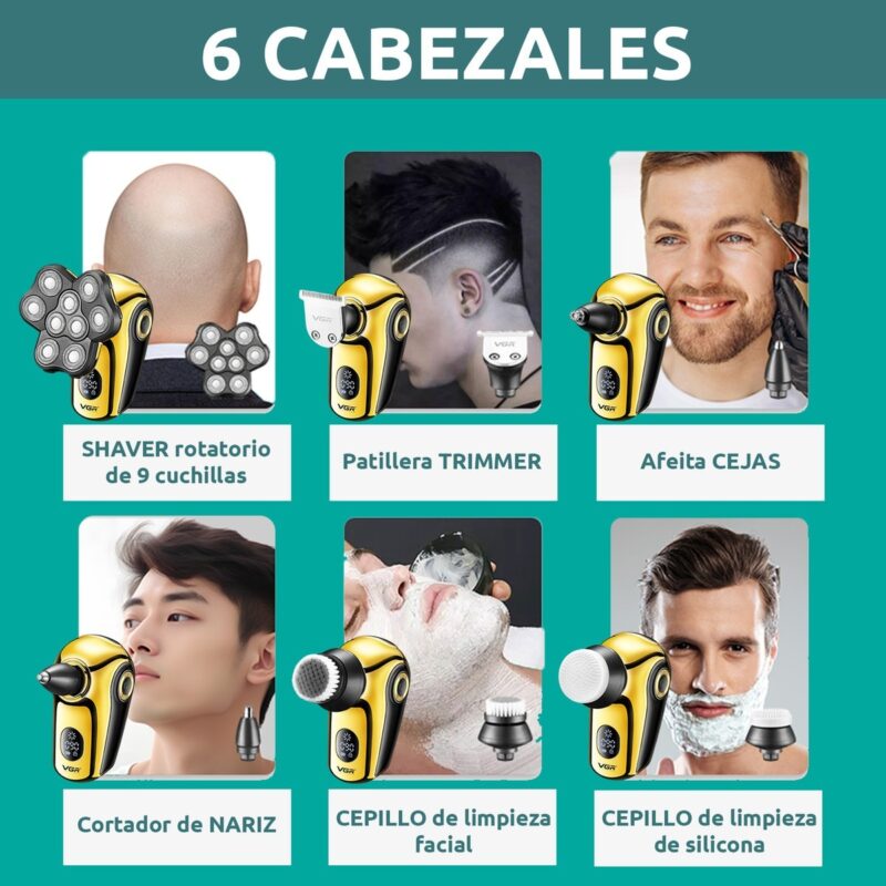 6 Cabezales: Afeitadora rotativa, recortadora de precisión, recortadora de nariz, recortadora de ojos, cepillo de limpieza facial, cepillo de limpieza de silicona.