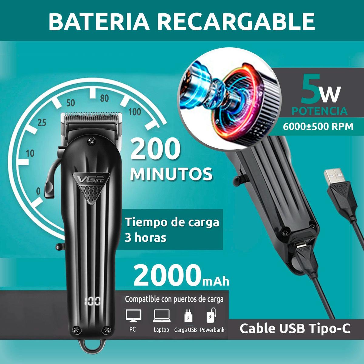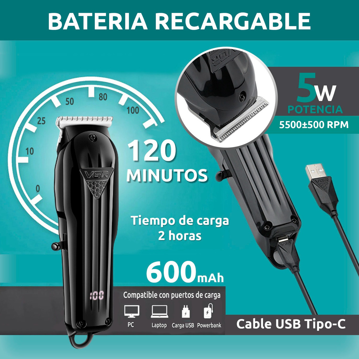 MAQUINA CORTA PELO BARBA VGR V-282 RECARGABLE USB Y DISPLAY LED INDICADOR DE BATERIA